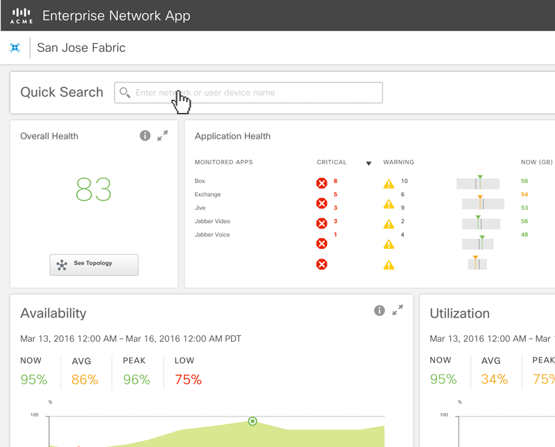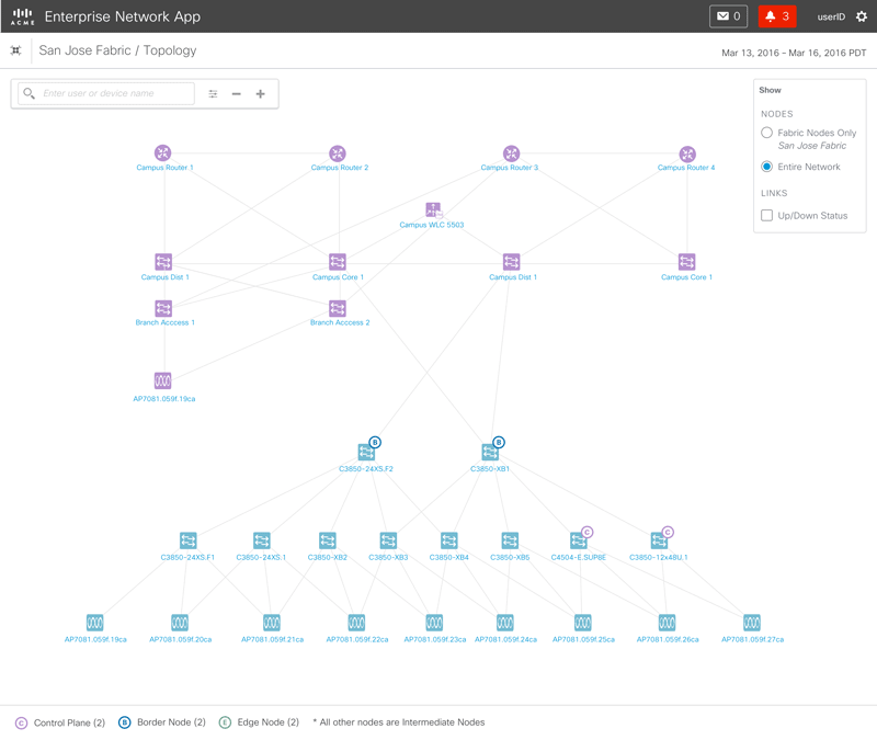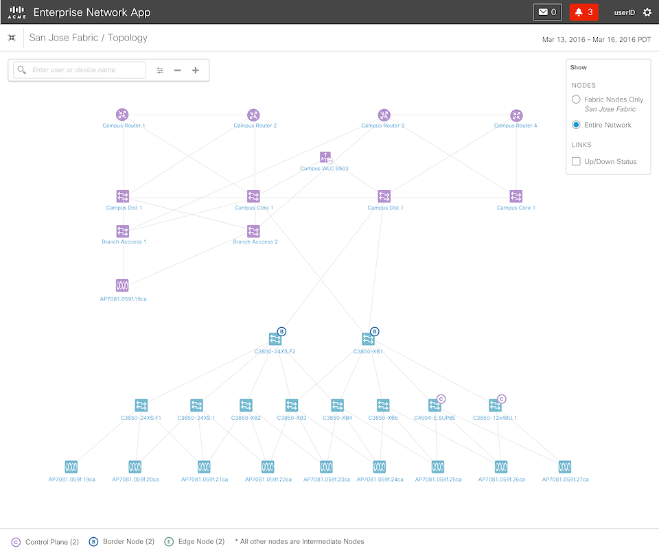The topology button near the health score takes the user to the fabric topology, made up of devices that were selected during the provisioning phase. The topology is where the user can dig down into individual devices.
