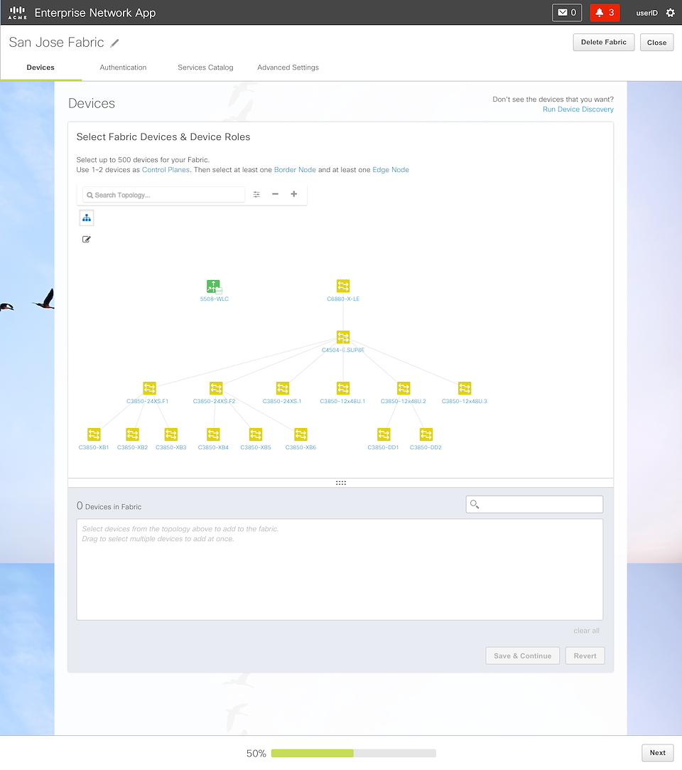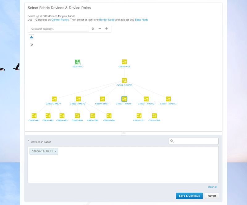 Rather than being last, fabric provisioning is now center stage of the entire Provisioning process. To provision the fabric, the user just needs to select the devices for the fabric. Recommendations for device roles are automatically made in case the user doesn’t know or want to bother.