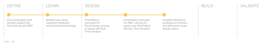 Our team was tasked to design the frontend application, responsible for two major functionalities, Provisioning and Monitoring & Troubleshooting (M&T). I worked as the project lead and UX designer, and my teammate handled the visual design.