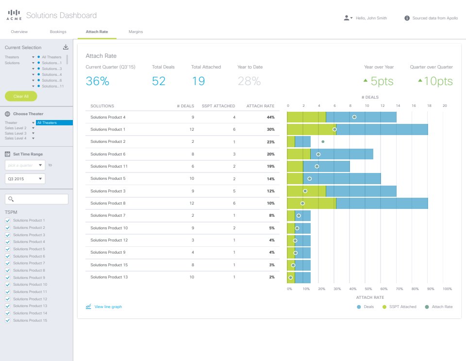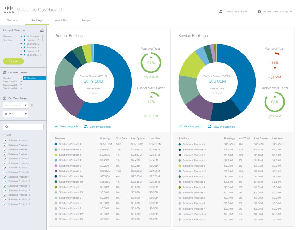 Individual product managers can dig deeper into Bookings, Attach Rate, or Margins. It is highly likely that the first task of a first-time visitor would be to filter the data down to their corresponding job responsibilities, so we made sure to make the filtering pane discoverable.