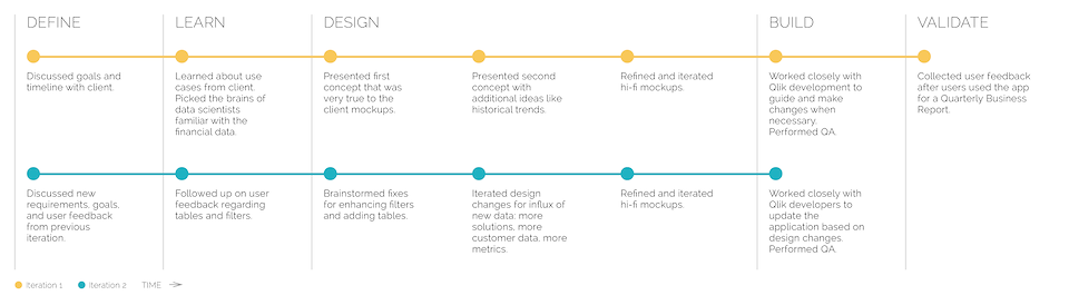 Recall that the original requirements from the client consisted of just snapshot comparisons of metrics, i.e. two pie charts. Simple, but based on user feedback, it just doesn’t quite satisfy the user’s needs. Through synthesis of user feedback, we added additional facets to the data, e.g. historical trend, customer breakdown, and tables.