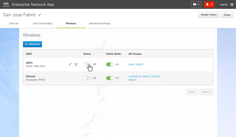 After the wireless controllers are in place, all that’s left to do is for the user to choose which wireless networks to make available to users in the fabric.
