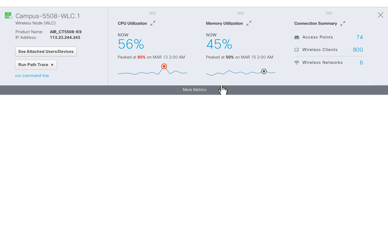 For Monitoring & Troubleshooting (M&T), we designed separate dashboards because wireless metrics are vastly different from wired metrics. Simply adding the wireless metrics to the original dashboard design would have yielded something overwhelming.