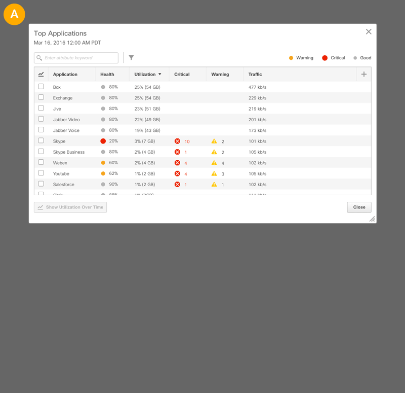 We designed a series of miniature dashboards, or dashlets, to be used by each device type Some dashlets, like “CPU Utilization” is common across all devices, but others, like “Top Clients”, are quite specific to the device type.