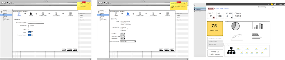 Figure 1 – Wireframe mockups from the client team, showing the requirements for wireless network Provisioning and ideas for wireless network M&T.