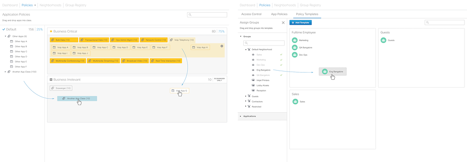 We recognized that there are roughly, two dichotomies for policy configuration: policies that have to do with users and policies that have nothing to do with users. For example, the administrator cares about whether user A is allowed to access user B or application C. The administrator also cares about the quality of service of application C, regardless of who is using it or not.