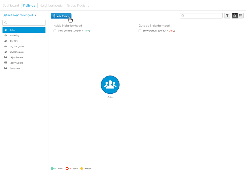 Neighborhoods define the model used to describe default policies. If things (users, applications, servers) are in the same neighborhood, then they can access each other by default. We designed a page to manage the membership of each neighborhood.